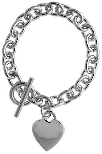 This Sterling Silver Bracelet is All Hand Made. Very Solid, Heavy, Well Polished, Well Finished and Very Very Well Made. The links are Oval, about 10 mm (3/8") Wide and comes with a Toggle Clasp for Easy Wear and a Great Look. It has a Hanging Heart Disk 13/16" (21 mm) wide, that is also Nice and Heavy and perfect for Engraving. It Comes in Bracelet Sizes 7"& 8" and 18 inch necklace
